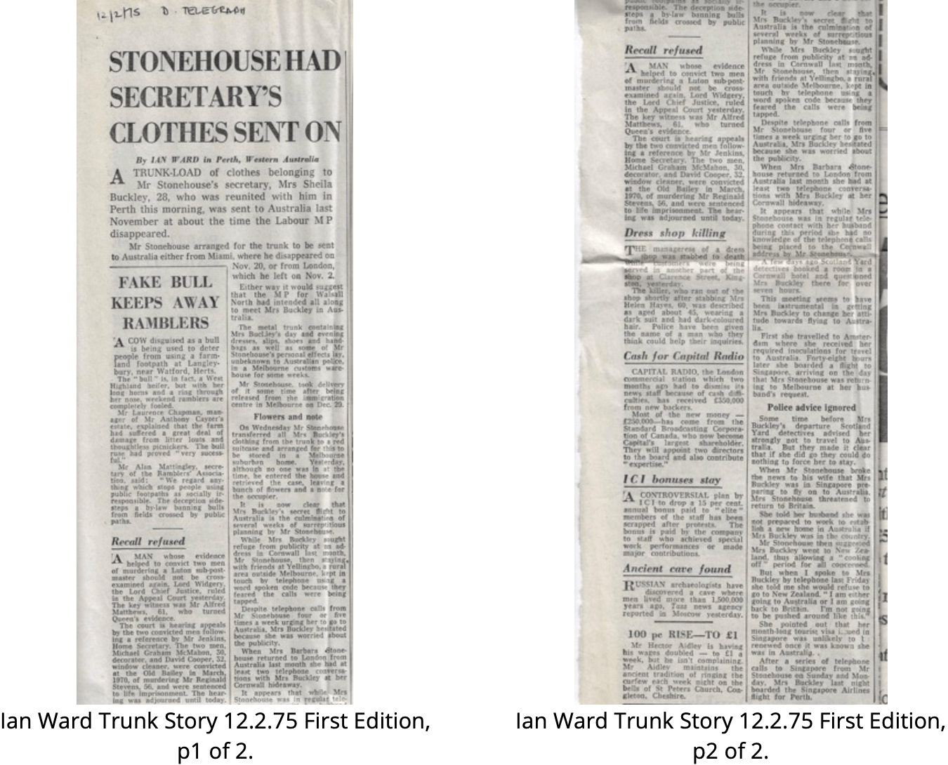 Please find attached three documents: a) The Daily Telegraph, 2 editions, 12 February 1975, by Ian Ward, regarding his story that my father had sent Sheila’s clothes in a trunk from London to Melbourne before he faked his death; b) a schedule of the Old Bailey proceedings 19-20 July 1976 showing that a statement by Robert Hill was read to the court after my sister Jane’s evidence and before Sheila’s statement from the dock. Robert Rowland Hill was the customs officer who opened the trunk when it arrived in Melbourne and saw that it did not contain any women’s clothing, thus showing that the journalist Ian Ward could not have been correct; c) page 332 from Julian’s book where he completely cuts out the evidence of Robert Hill, instead saying after my sister’s evidence “With this evidence the Stonehouse defence was complete.” Why is Robert Hill missing? I suppose lawyers are used to picking and choosing what evidence they want to present in court but I think it is disingenuous to ignore a vital witness in a book that purports to be an accurate rendition of events. Julian Hayes has 108 pages on legal proceedings (pages 241-349), and eleven pages on Ian Ward and his erroneous trunk story (pages 104, 187-9, 202-3, 309-13) and he knows exactly how important Ian Ward’s article was because he opens chapter 44 (page 309) with the words “Another significant witness relied on by the prosecution was the Daily Telegraph’s South-east Asian correspondent, Ian Ward, who had ‘befriended’ Stonehouse after his discovery in Australia.” Yet Julian has chosen to whitewash out of his narrative the independent official and unbiased witness who contradicted Ian Ward’s trunk story. As a lawyer yourself, would you classify this as mala fide? Please ask Julian to explain why he has ignored the very important witness Robert Rowland Hill. Or perhaps I have overlooked where he has mentioned him in the book – although I have of course read the book and can’t see a reference to Robert Hill in the Index. If I am wrong about this omission please let me know.