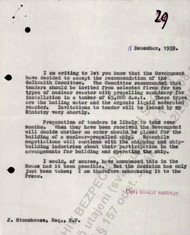 I turn now to the contents of the letter. It is dated 18 December, the day after the HOC rose for the Christmas recess. As you can see, it relates to the Minister having taken the decision to accept the recommendation of the Galbraith Committee to invite tenders for nuclear reactors with propelling machinery. This was for commercial shipping, not military. Hansard records that, even two years later, the tendering process was still not complete. Most importantly, as you can see in the last paragraph, Marples states that “I would, of course, have announced this is the House had it been possible. But the decision has only just been taken; I am therefore announcing it to the Press.” In other words, there is nothing secret or even remotely confidential about this matter as the Press are about to be informed. The Minister wrote this letter, to all five MPs who had asked questions I would think, as a matter of routine procedure and courtesy so they would be informed of the decision before they read it in the newspapers. That is all this piece of paper is about.