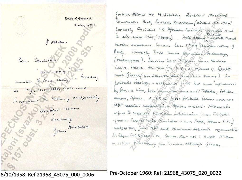 The document on the right is reproduced in Julian’s book with the rather overblown caption: “One of Stonehouse’s handwritten notes on members of the African National Congress (in this case Joshua Nkomo) provided to the Czech State Security Agency and found by the author in their files.” (I say ‘overblown’ not only because Julian is so fond of saying papers were “found by the author in their files” and on page 28 for example “File 43075, long buried in the StB archive …” when the files are not hidden or buried or bulging but have been available digitally since 2008 to anyone who asks to see them, or purchase them on CD at a cost of about £4).