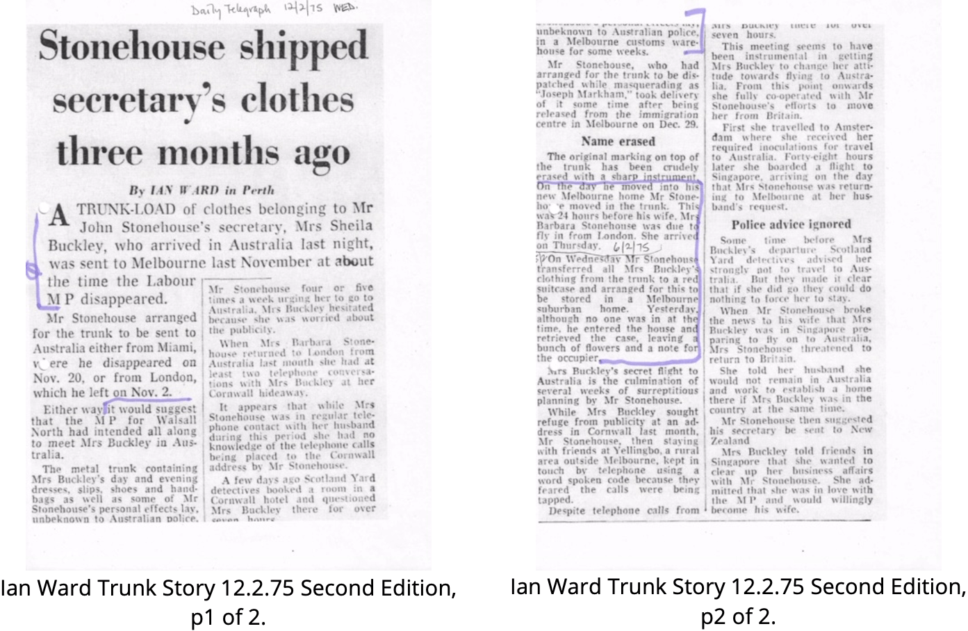 Please find attached three documents: a) The Daily Telegraph, 2 editions, 12 February 1975, by Ian Ward, regarding his story that my father had sent Sheila’s clothes in a trunk from London to Melbourne before he faked his death; b) a schedule of the Old Bailey proceedings 19-20 July 1976 showing that a statement by Robert Hill was read to the court after my sister Jane’s evidence and before Sheila’s statement from the dock. Robert Rowland Hill was the customs officer who opened the trunk when it arrived in Melbourne and saw that it did not contain any women’s clothing, thus showing that the journalist Ian Ward could not have been correct; c) page 332 from Julian’s book where he completely cuts out the evidence of Robert Hill, instead saying after my sister’s evidence “With this evidence the Stonehouse defence was complete.” Why is Robert Hill missing? I suppose lawyers are used to picking and choosing what evidence they want to present in court but I think it is disingenuous to ignore a vital witness in a book that purports to be an accurate rendition of events. Julian Hayes has 108 pages on legal proceedings (pages 241-349), and eleven pages on Ian Ward and his erroneous trunk story (pages 104, 187-9, 202-3, 309-13) and he knows exactly how important Ian Ward’s article was because he opens chapter 44 (page 309) with the words “Another significant witness relied on by the prosecution was the Daily Telegraph’s South-east Asian correspondent, Ian Ward, who had ‘befriended’ Stonehouse after his discovery in Australia.” Yet Julian has chosen to whitewash out of his narrative the independent official and unbiased witness who contradicted Ian Ward’s trunk story. As a lawyer yourself, would you classify this as mala fide? Please ask Julian to explain why he has ignored the very important witness Robert Rowland Hill. Or perhaps I have overlooked where he has mentioned him in the book – although I have of course read the book and can’t see a reference to Robert Hill in the Index. If I am wrong about this omission please let me know.